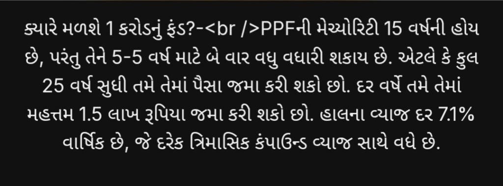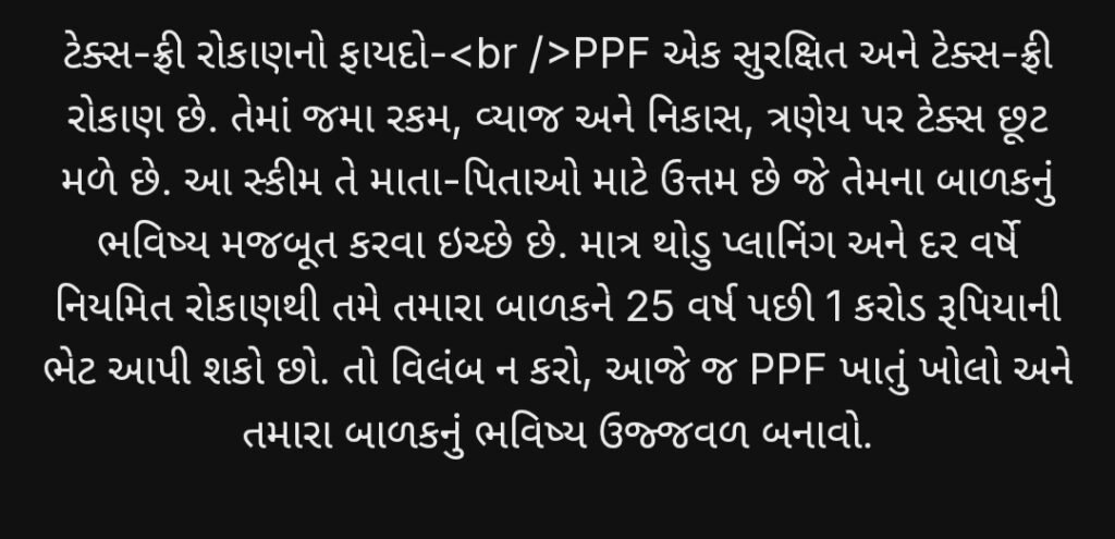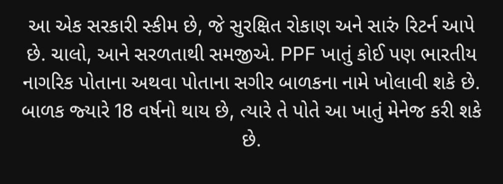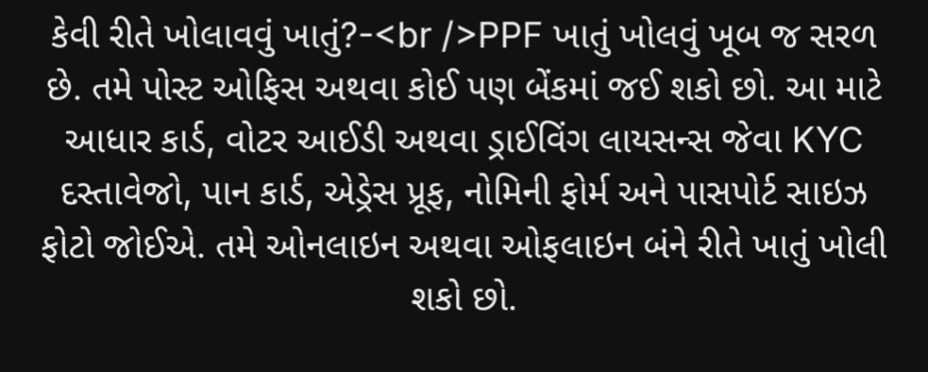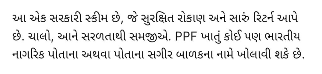 અહીં પબ્લિક પ્રોવિડન્ટ ફંડ લગત તમામ જરૂરી જાણકારી કે જેમાં મહત્તમ પરિપક્વતાની સમય મર્યાદા કેટલી છે તેમનો હપ્તો કેટલો છે કેટલું રોકાણ મેક્સિમમ કરી શકાય છે અને કયા કયા ડોક્યુમેન્ટની જરૂર છે અને તમે કેવી રીતે ક્યાંથી આ એકાઉન્ટ ખોલાવી શકો છો જે ઇન્કમટેક્સના એનસીસી અંતર્ગત રાહત મળવાપાત્ર છે માટે દરેક લોકો એ આ પીપીએફ એકાઉન્ટ ખોલાવવું જોઈએ જેમાં કોઈપણ જાતને નુકસાની નથી અને લાંબાગાળાના સુરક્ષિત રોકાણ માટેની સૌથી સલામતી યોજના છે