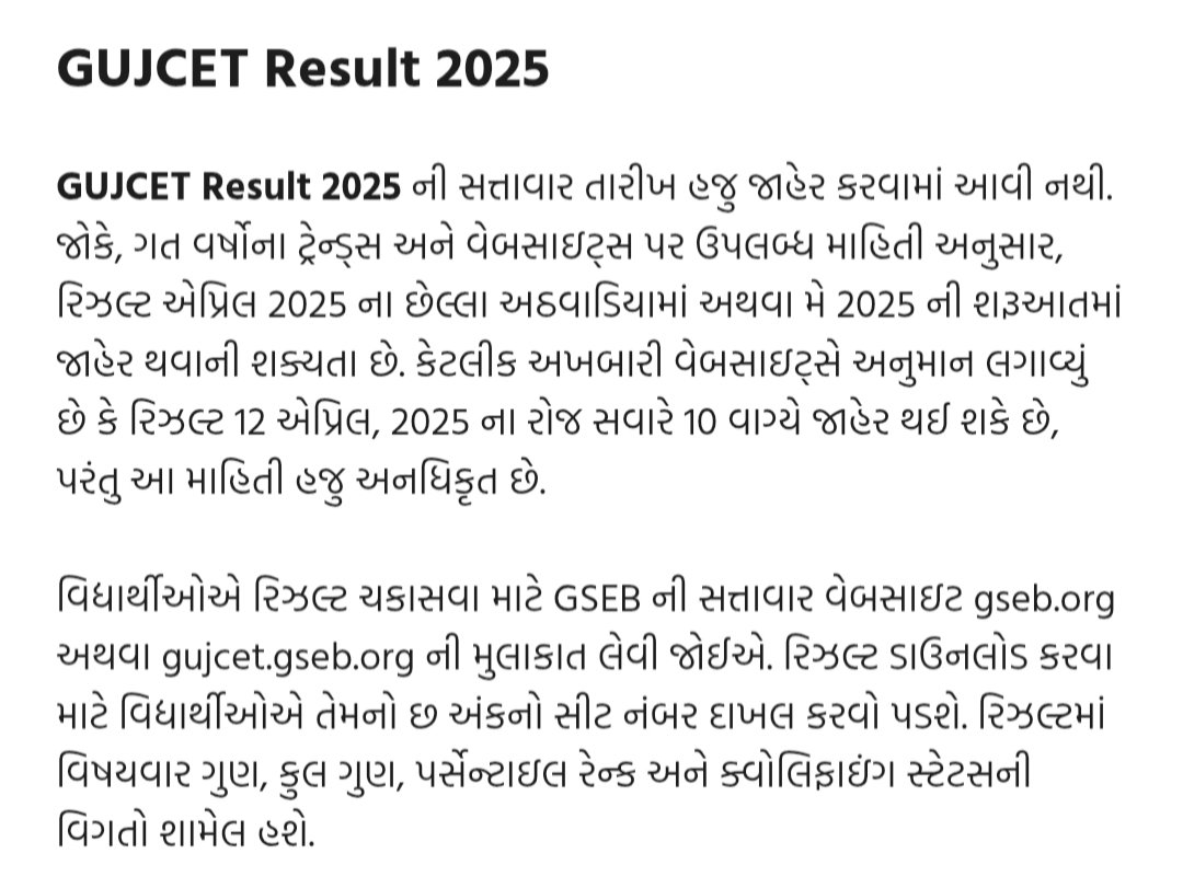 Gujcet result 2025: ગુજરાત માધ્યમિક અને ઉચ્ચતર માધ્યમિક શિક્ષણ બોર્ડ દ્વારા યોજાતી ગુજરાત ટેસ્ટ ગુજકેટ 2025 ની પરીક્ષા 23 માર્ચ 2025 ના રોજ યોજાય હતી. આ પરીક્ષા ગુજરાતની ઇજનેરી, ફાર્મસી અને ડિપ્લોમા કોર્સમાં પ્રવેશ મેળવવા માટે મહત્વની છે. હવે વિદ્યાર્થીઓ અને વાલીઓ આતુરતાથી રીઝલ્ટની રાહ જોઈ રહ્યા છે. ત્યારે આ લેખમાં અમે ગુજકેટ પરીક્ષાનું પરિણામ ક્યારે જાહેર થશે તેની સંભવિત તારીખ, છેલ્લા ત્રણ વર્ષના ડેટા અને ટોપર્સની માહિતી શેર કરી રહ્યા છીએ. જે તમને ખૂબ જ ઉપયોગી થશે.