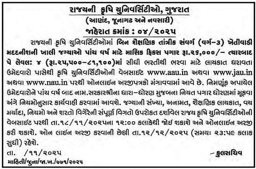if you are looking for a stable and promising career in the agriculture sector within Gujarat, we have some fantastic news for you. The combined state Agriculture University Anand Agriculture University Junagadh Agriculture University and Navsari Agriculture University have released a significate notification for Gujarat agriculture Universities requirement 2025. This is a massive opportunity for candidates who wish to serve in the technical field of agriculture. The notification officially released under advertisement number 04/ 2025, invite applications for the post of agriculture assistant ( ખેતીવાડી મદદનીશ ).
