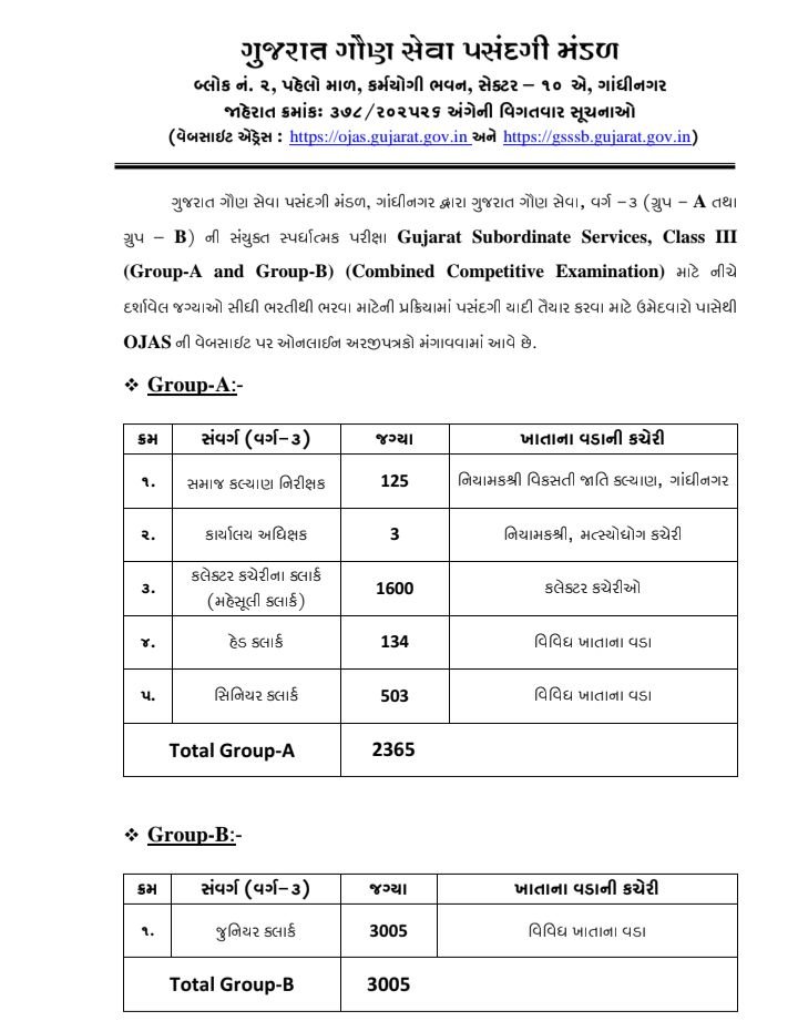 A total of 5370 vacancies have be announced by the Gujarat subordinate services election board for a various group and and group of b post. Including a clerk junior clerk and other post candidate can check the detail below.