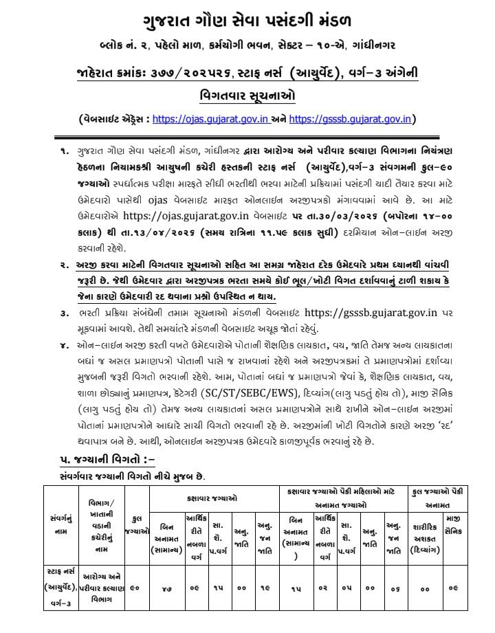 Staff Nurse (Ayurveda) Bharti 2026: ગુજરાત ગૌણ સેવા પસંદગી મંડળ દ્વારા સ્ટાફ નર્સ આયુર્વેદ વર્ગ ૩ ની ભરતી અંગેની સત્તાવાર જાહેરાત બહાર પાડવામાં આવેલી છે. યોગ્ય લાયકાત ધરાવતા ઉમેદવારો તારીખ 13 એપ્રિલ 2026 સમય રાત્રે ના 11: 59 કલાક સુધી ઓનલાઇન અરજી કરી શકશે.
